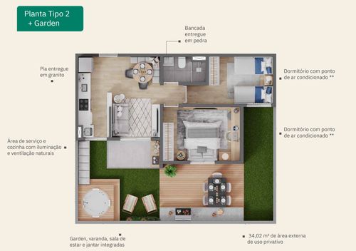 Planta de 80,27, sao 2 quartos, sala de jantar e estar, cozinha e espaço garden.